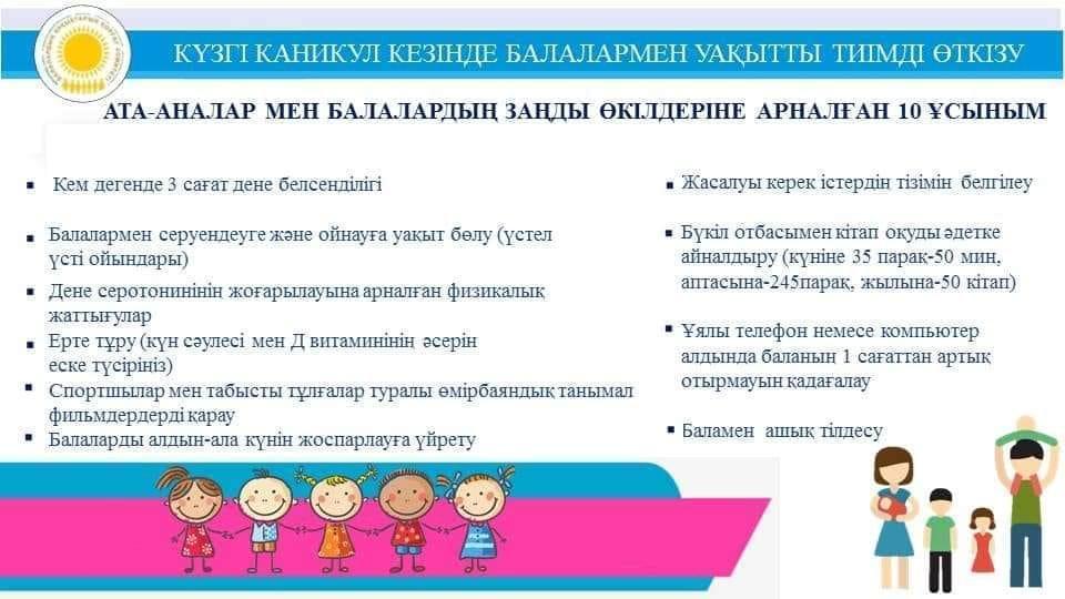 02 ноябрь 2021 0 1 2 3 4 5 Күзгі каникул кезінде балалармен уақытты тиімді өткізуге ата-аналар мен балалардың заңды өкілдеріне арналған 10 ұсыным